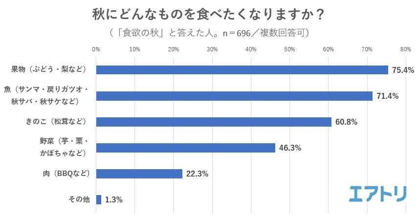 「果物(ぶどう・梨など)」が75.4%の支持を得て1位となりました。2位は「魚(サンマ・戻りガツオ・秋サバ・秋サケなど)」、3位は「きのこ(松茸など)(60.8%)」と続きました。