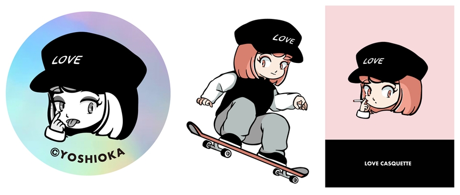 作者はYoshioka、キャラクター名もYoshioka。愛称は「LOVEガール」「LOVEキャスケット」「ヨシオカちゃん」などで親しまれている。実績として、個人活動でのNFT合計取引量は40ETH以上。アパレルブランドとのコラボや音楽ジャケットやMVの制作など。NFTの展示会や物販イベント、デザインフェスタへの参加など積極的に活動している。