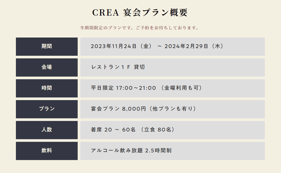 キラナガーデン豊洲、レストランCREAともに、宴会プランに関してはお電話にて受け付けております。まずはお気軽にご相談ください。