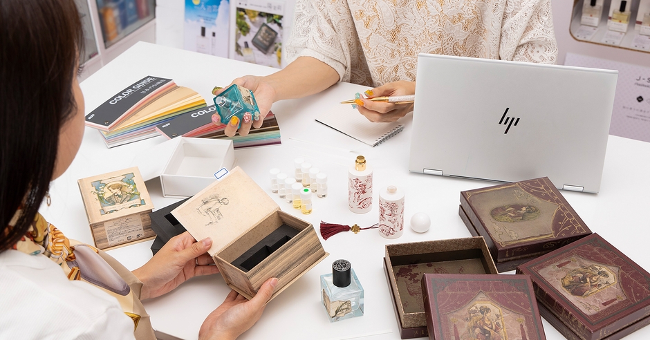 打ち合わせを繰り返し、完成度を追求したアートワークやデザインはもちろん、2種の香水それぞれに最適な資材選びを行い、Fataliteが目指している表現に妥協しないものづくりを行いました。