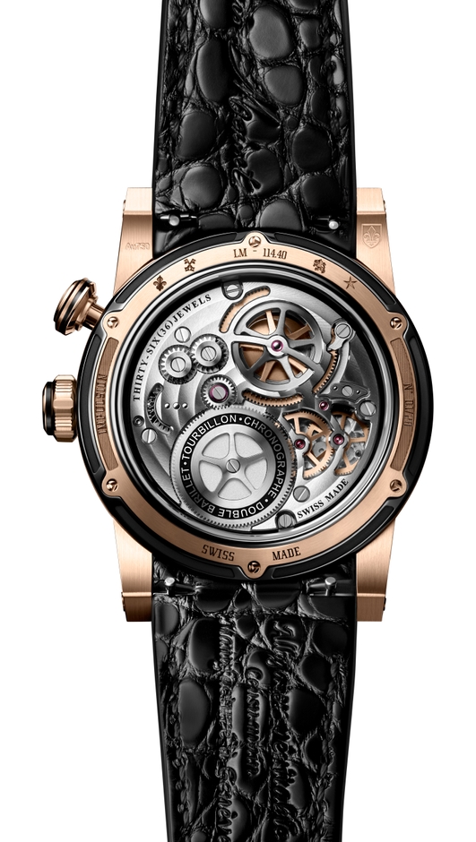 自社製の手巻きキャリバー・LM114を搭載。文字盤側に配置されたクロノグラフ機構とトゥールビヨンの機能美を同時に愉しめます。クロノグラフは、プッシャーの操作性・動作の安定性・耐久性に優れた、高級機の代名詞であるコラムホイール式です。