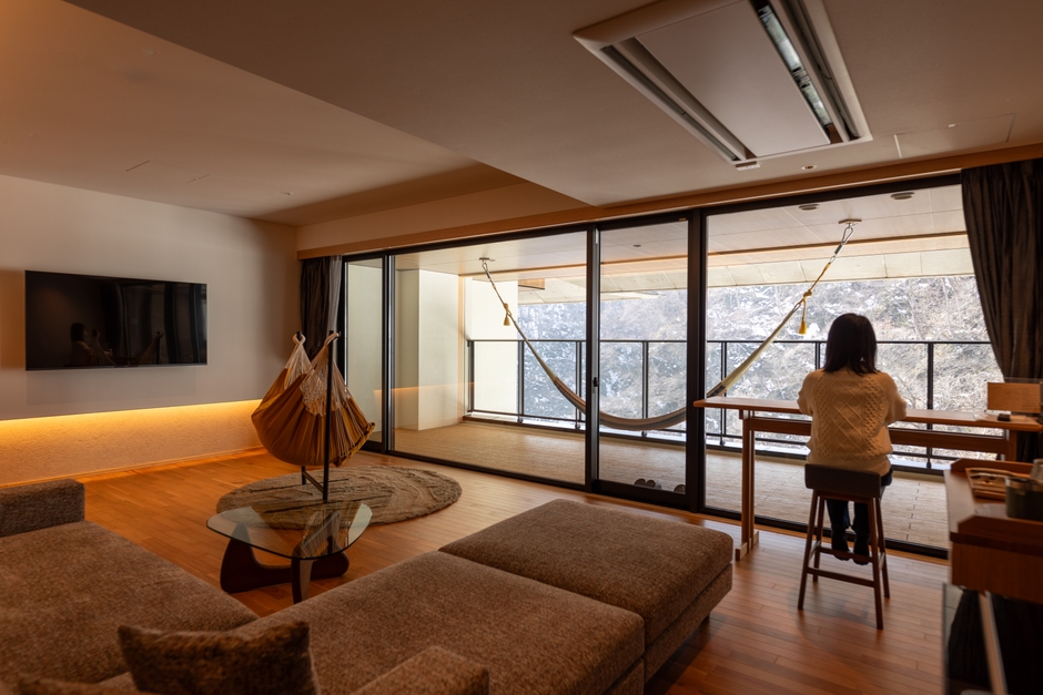 「里山Seyryuプレミアビュースイート」は、源泉かけ流し露天風呂、プライベートロウリュサウナ、ハンモックテラスは共通ですが、1部屋ごとに間取りが異なります。お部屋は、地元職人がつくりあげたソファなど、里山を望む窓側に向けて家具が配置され、里山の景色をゆっくりと愛でる時間が愉しめるようになっています。「お気に入りはこのお部屋」同じお部屋をリピートしてくださるお客様もいるほどです。