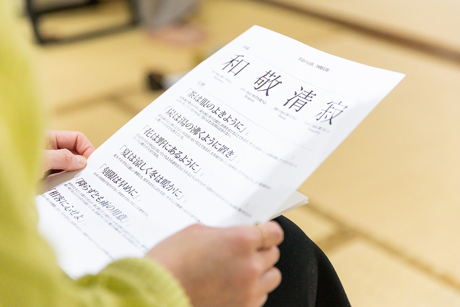 茶道の精神、和敬清寂、一期一会についての説明を聞きます。