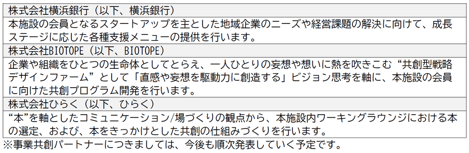 また、本施設は、横浜エリアにおける事業共創による社会課題解決のための複合施設となることを目指し、下記のパートナーと協業することが決定いたしましたのでお知らせします。