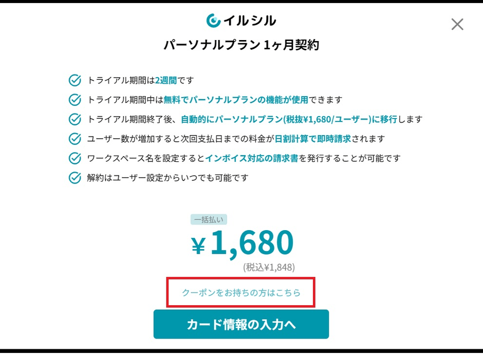 「イルシル」の有料プランご契約の際、クーポンコードを入力することで自動で割引が適用されるようになります。