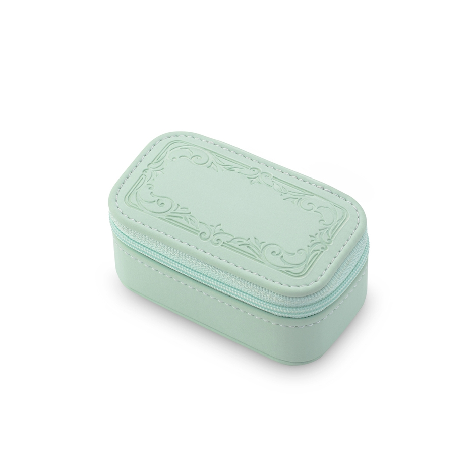 トレンドのニュアンスカラー「アイスグリーン」「パウダーピンク」「シャンパンゴールド」に、天面の模様は異なるデザインで展開。バッグにしのばせてお出かけしたり、ご自宅でジュエリーを収納することに使用できるアイテムです。