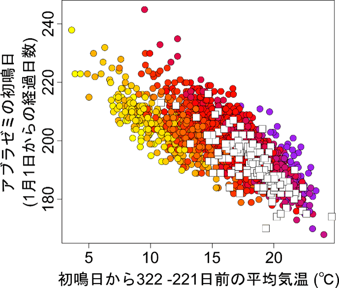 図2. モデル選択法でベストモデルに選ばれた気温変数と初鳴日との関係。〇は2020年以前に観測されたデータで、色の違いは観測場所の違いを表し、□は2021年以降に市民調査員が調べた結果を示している。