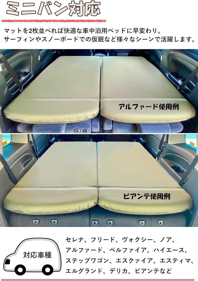 車内の後部座席を倒してインフレーターマットを2枚並べると快適な車中泊用ベッドに早変わり!セレナ・フリード・ヴォクシー・ハイエース・アルファード・ベルファイア・ビアンテなどのミニバンに対応しています。インフレーターマットはアウトドアシーンだけでなく防災グッズとしても重宝します。万が一に備えてご家族分準備しておくと心強いアイテムです。