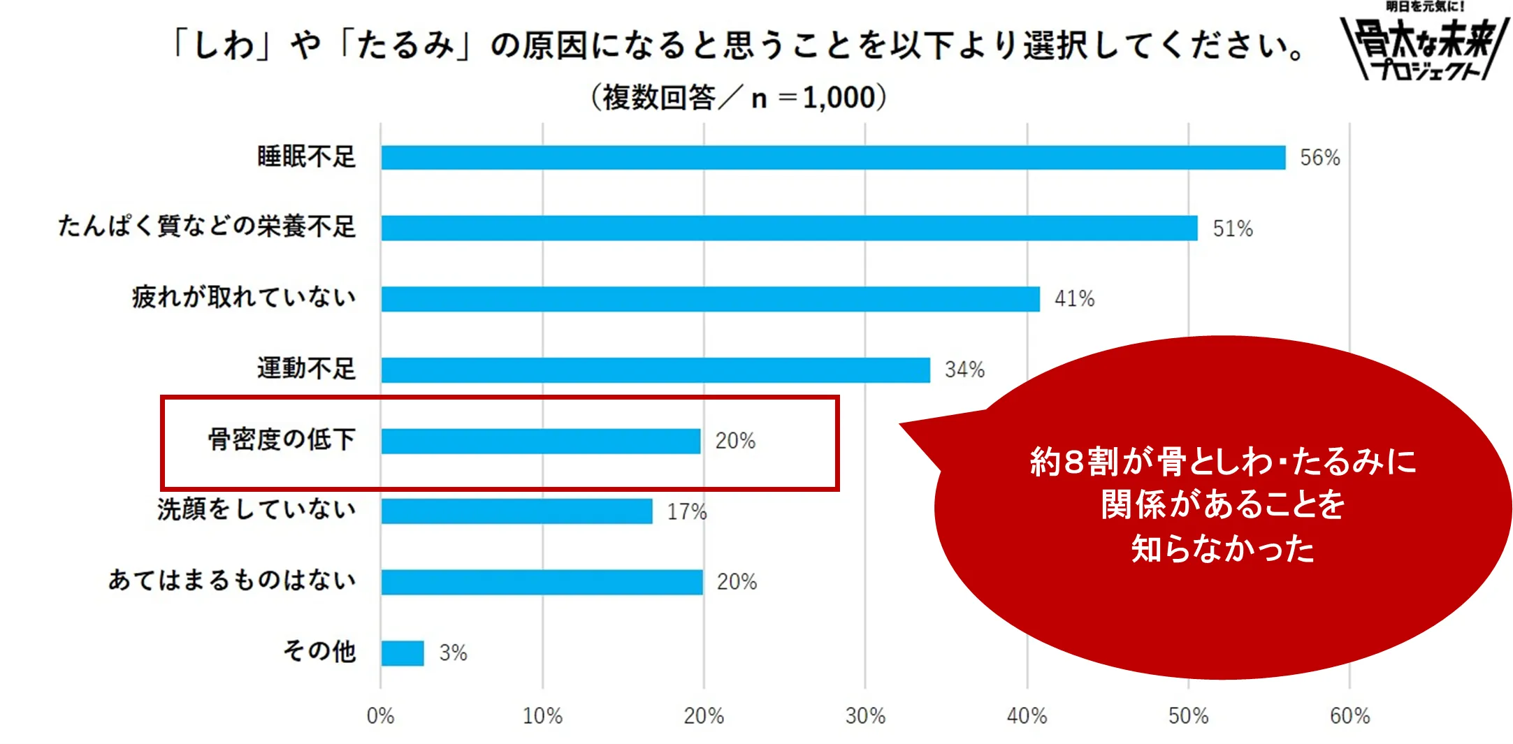 「しわ」や「たるみ」の原因になると思うことを選んでください」という問いに対して、「骨密度の低下が原因になる」と回答した人はわずか20%となり、8割の人が知らないことがわかりました。