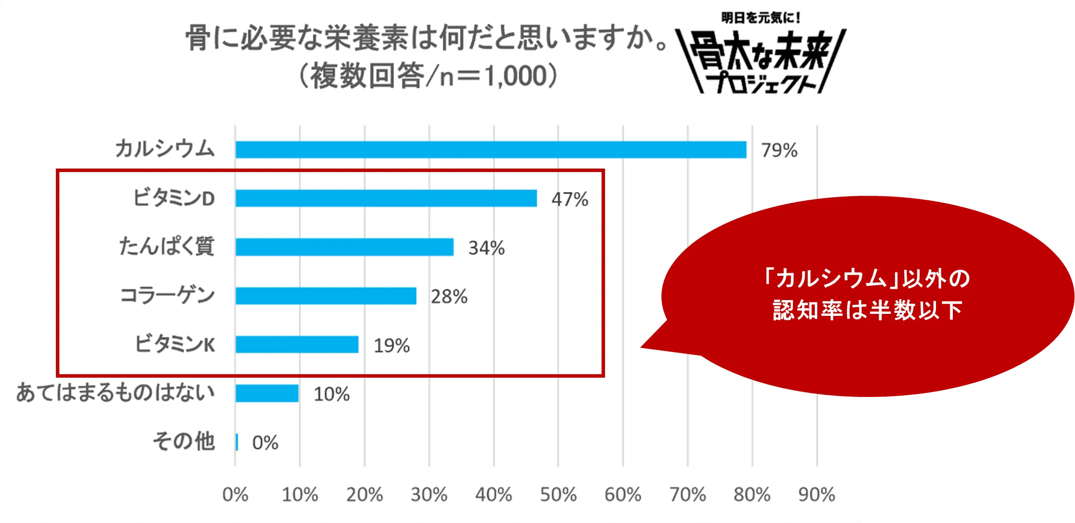 骨に必要な栄養素について聞くと、「カルシウム」と答えた人は約8割であった一方、「ビタミンK」「コラーゲン」「たんぱく質」「ビタミンD」については半数以上が必要なことを認知していませんでした。