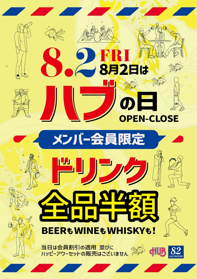 当社は8月2日を「ハブの日」とし、お客様感謝デーとして毎年セールを実施しております。「ハブの日」はHUB・82全店が終日(一部店舗では16時~)、メンバー会員様を対象にドリンク全品半額で営業いたします。当日までにご入会されたメンバー会員様が対象となりますので、ご来店された際にはHUB・82メンバー会員への入会をおススメしております。