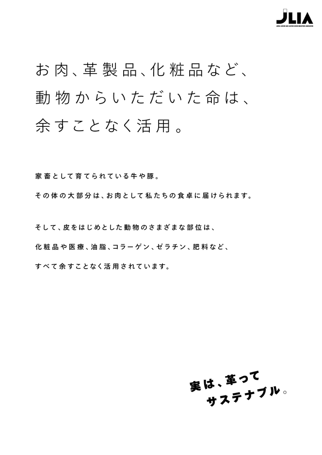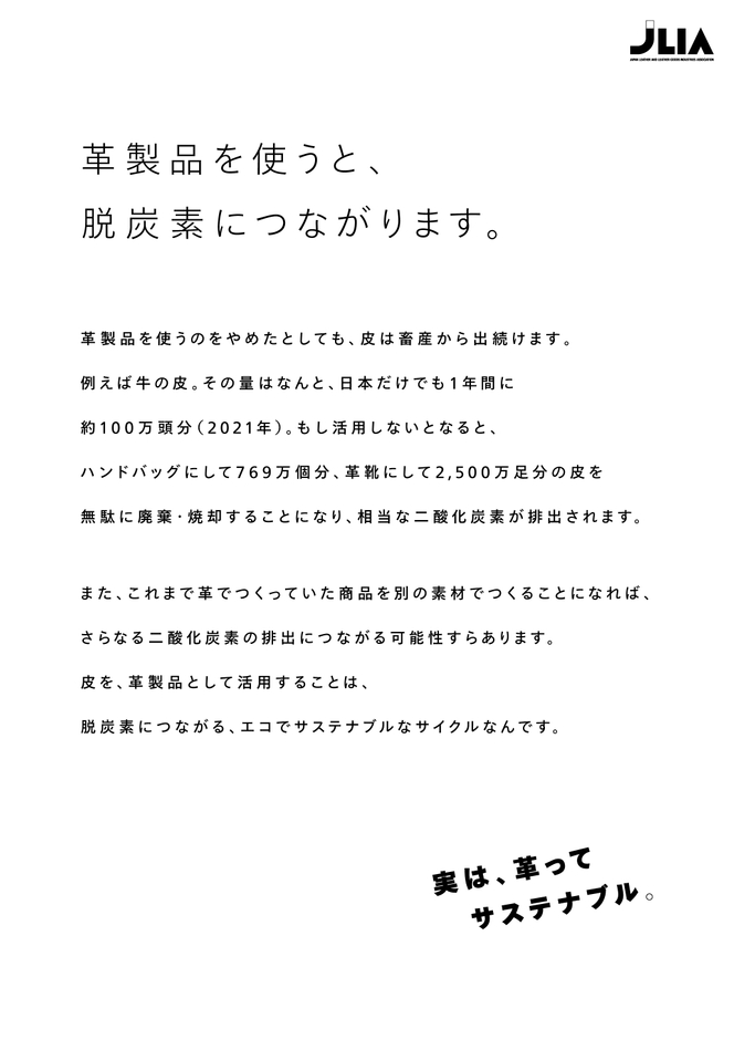 Thinking Leather Actionとは、皮革原材料~靴・バッグ・鞄・小物・ベルト・手袋・アパレルなどの革製品を取り扱う団体から成り立つ日本最大の総合団体である(一社)日本皮革産業連合会(JLIA)が主導する、皮革・革製品などのサステナビリティを発信していくプロジェクトです。革がなぜエコでサステナブルな素材なのかを正しい知識を基に理解を広める活動を行っています。