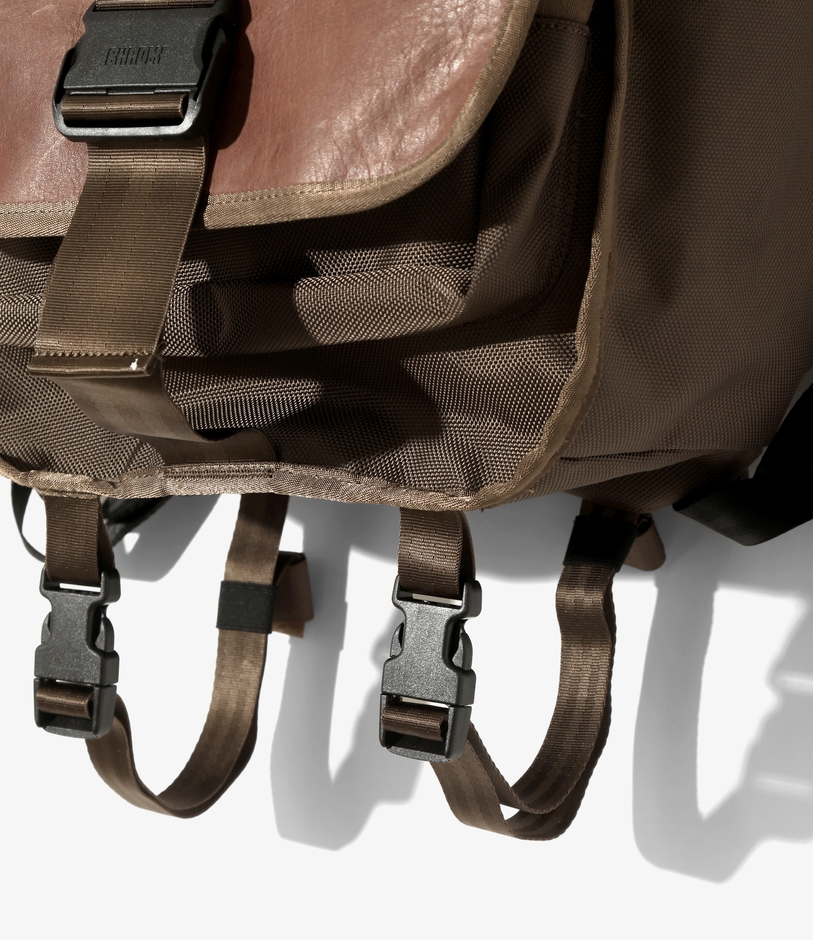 サイドとボトムのストラップは、オリジナルのままで急な荷物の増加にも対応可能。素材はメインボディ・ボトム共に防弾チョッキに使用されるほど耐久性に優れ、美しい光沢感が特徴的な1680Dリサクルバリスティックナイロンを使用しています。