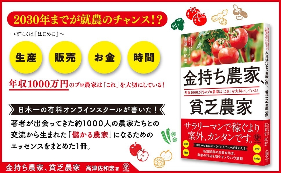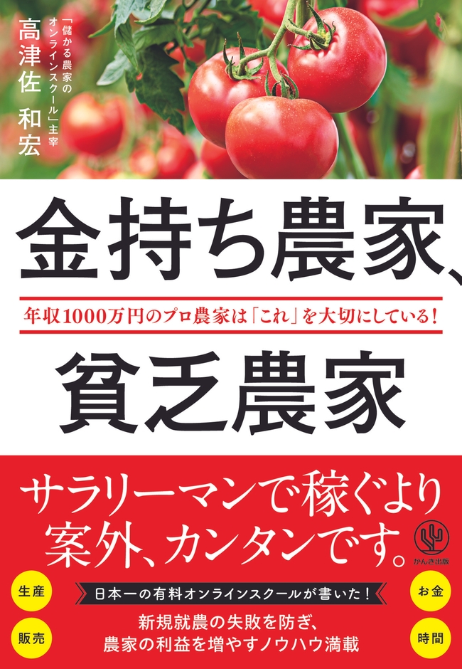 著者の高津佐和宏氏は、人気YouTubeチャンネル「農家の学校」を運営し、農業の有料スクールとしては日本有数の規模を誇る「儲かる農家のオンラインスクール」も主宰。