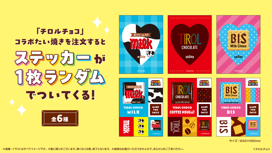 対象店舗にてチロルチョコ コラボたい焼きを1点ご購入につき、オリジナルシール(全6種)をランダムで1枚進呈いたします。