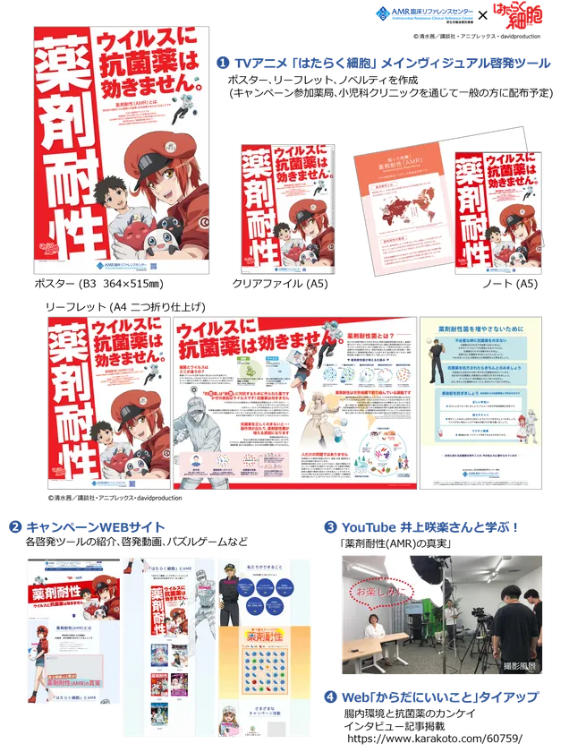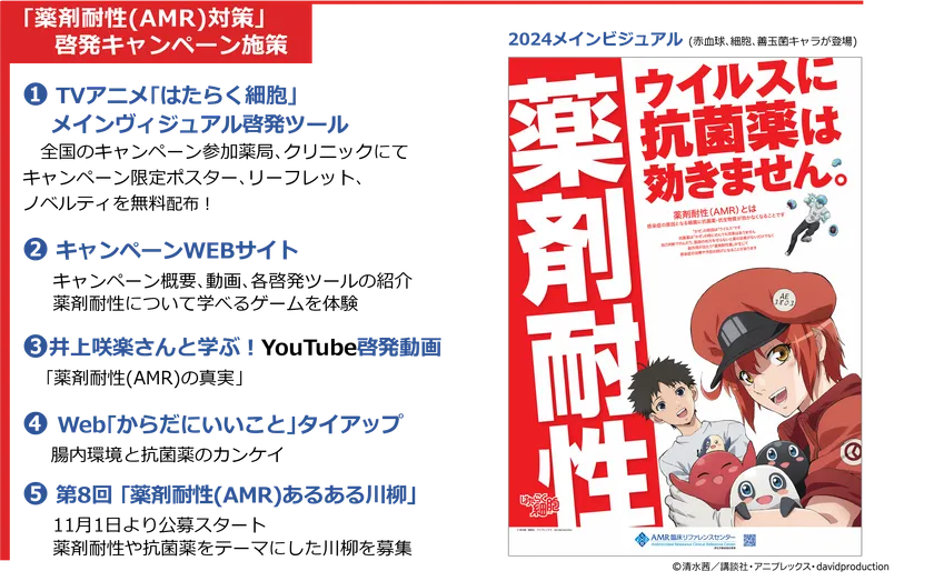 姫路市では、2016年の「薬剤耐性(AMR)アクションプラン」に基づき、さまざまな啓発の取り組みを行っているAMR臨床リファレンスセンターと協力し、11月の「薬剤耐性(AMR)対策推進月間」の啓発キャンペーンの一環として、TVアニメ「はたらく細胞」を起用した、「薬剤耐性」ポスター展示と啓発ツールの配布を行います。