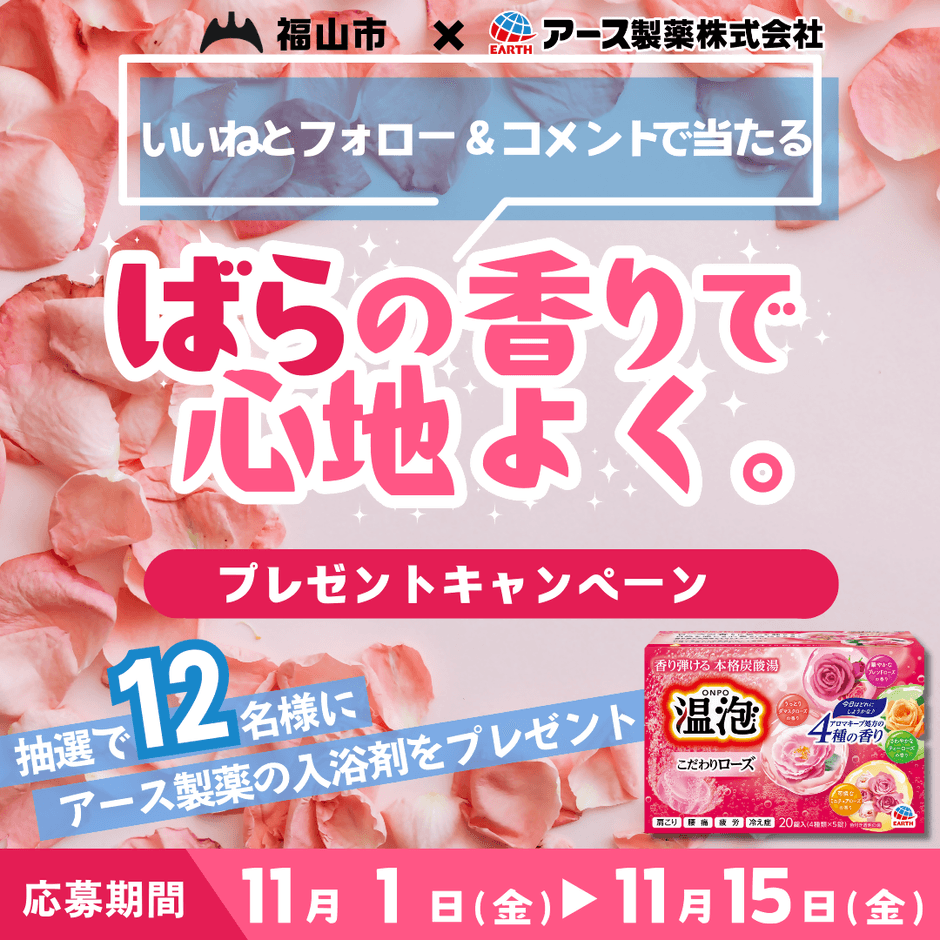 福山市では、市の魅力・観光情報を市内外に届けるため、福山市公式インスタグラムアカウントを運用しています。この度、ばらのまち福山の市外認知拡大を目的として、本市の包括連携協定企業であるアース製薬株式会社と連携し、市公式インスタグラムにてプレゼントキャンペーンを実施します。市公式インスタグラムをフォロー、キャンペーン投稿にいいね及びコメントした人の中から、抽選で12人にばらにちなんだ商品をプレゼントします。なお、包括連携協定の枠組みを活用した市公式SNSでのキャンペーンは本市初の取組となります。