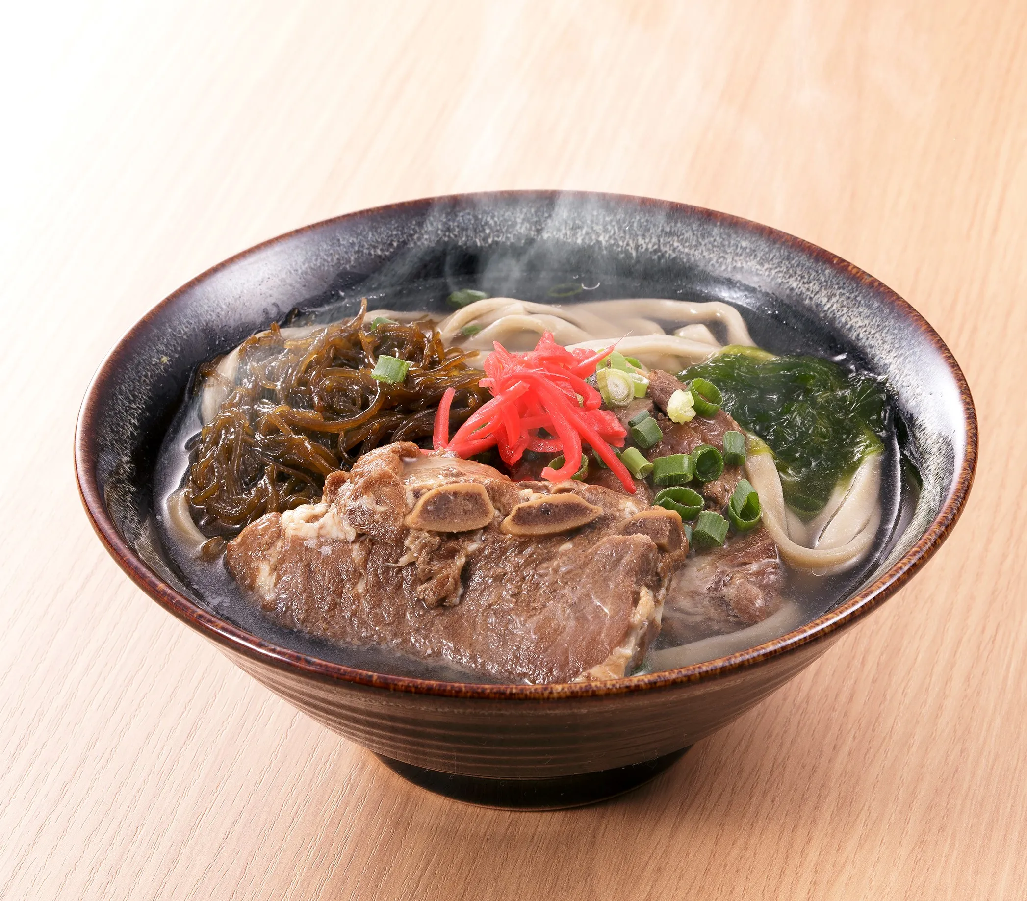沖縄の名物・ソーキともずくがトッピングされた、磯の香りを楽しめるもずくそば。
