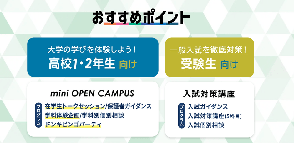 高1・2年生には『大学の学びを体験する場』を、受験生には『入試対策講座』を提供します!