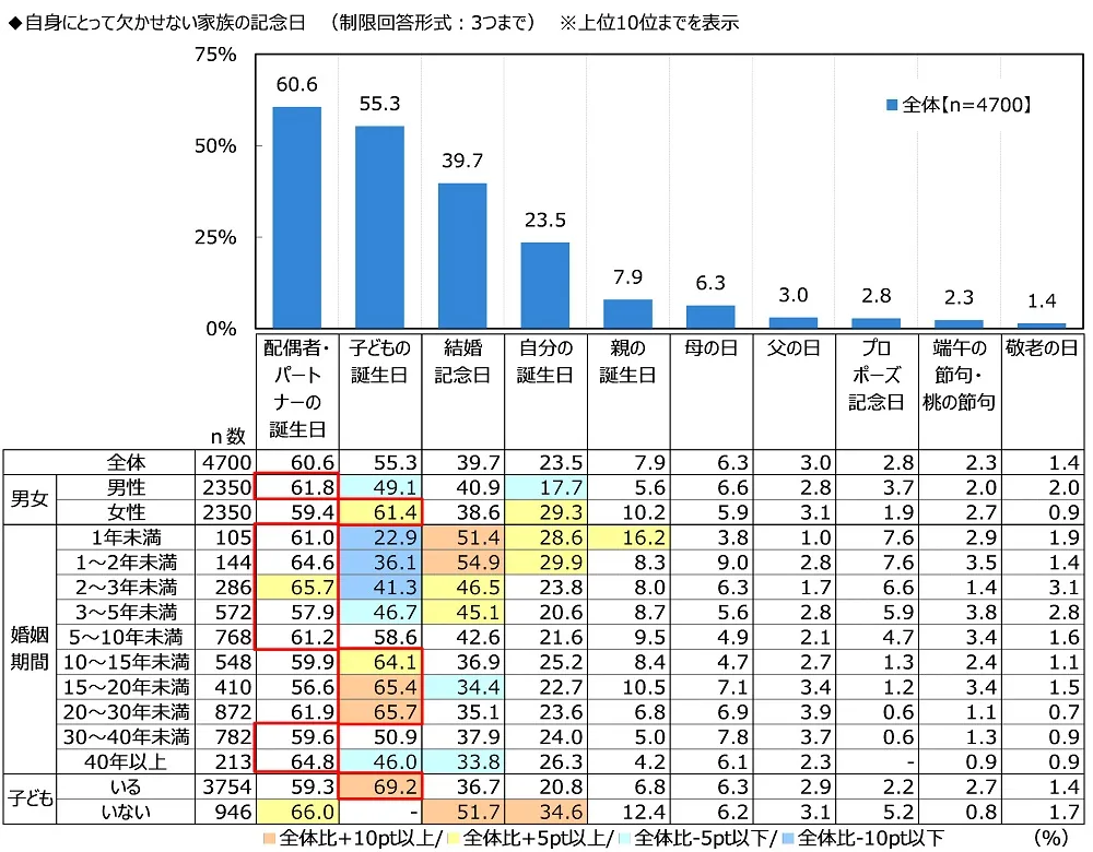 ・自身にとって欠かせない家族の記念日 1位「配偶者・パートナーの誕生日」2位「子どもの誕生日」3位「結婚記念日」