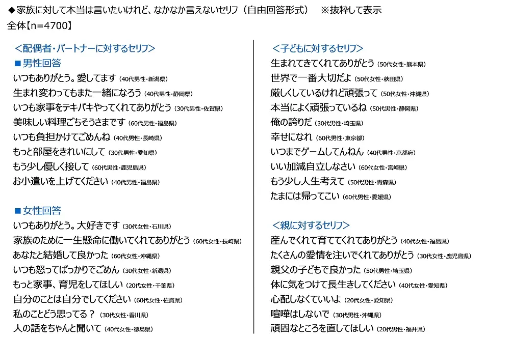 <配偶者・パートナー>に対するセリフをみると、男性回答では「いつもありがとう。愛してます」や「生まれ変わってもまた一緒になろう」、「いつも家事をテキパキやってくれてありがとう」、「もう少し優しく接して」、「お小遣いを上げてください」、女性回答では「いつもありがとう。大好きです」や「家族のために一生懸命に働いてくれてありがとう」、「あなたと結婚して良かった」、「自分のことは自分でしてください」、「人の話をちゃんと聞いて」といった回答が挙げられました。パートナーへの日頃のお礼や愛の言葉、要望などをなかなか伝えられない人が多いようです。