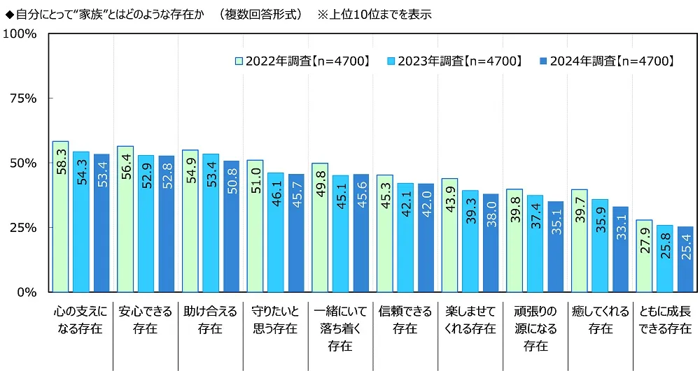 過去の調査結果と比較すると、「心の支えになる存在」は3年連続1位(2022年58.3%、2023年54.3%、2024年53.4%)でした。