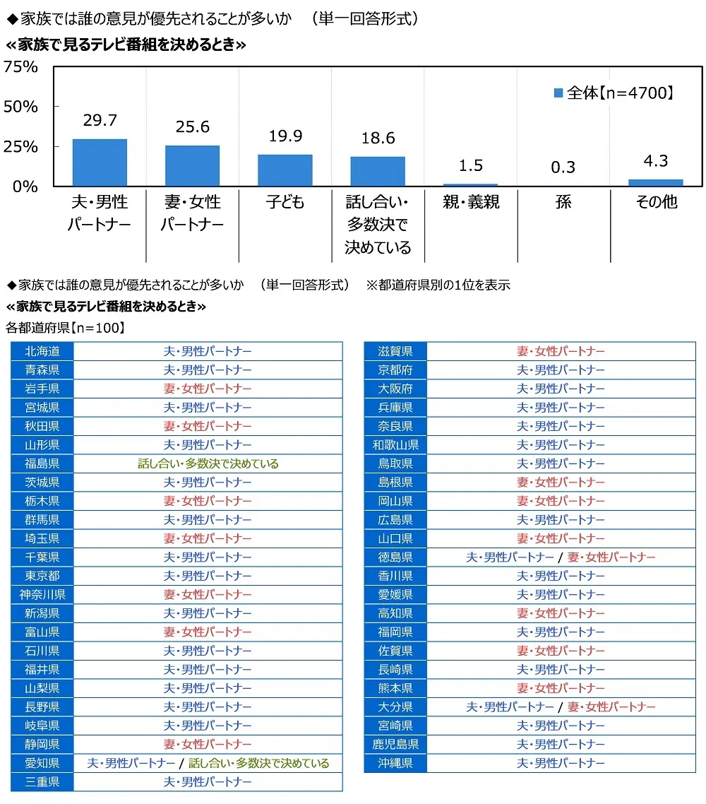 都道府県別にみると、多くの都道府県で「夫・男性パートナー」か「妻・女性パートナー」が1位となり、福島県では「話し合い・多数決で決めている」が1位、愛知県では「夫・男性パートナー」と「話し合い・多数決で決めている」が同率1位でした。