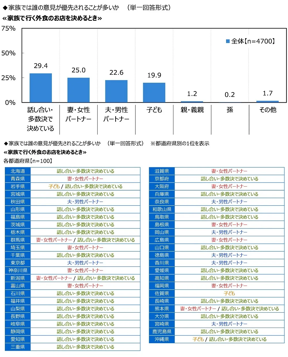 ≪家族で行く外食のお店を決めるとき≫では「話し合い・多数決で決めている」(29.4%)が最も高くなりました。家族みんなで相談して、民主的な決め方でお店を選んでいるという家庭が多いようです。次いで高くなったのは、「妻・女性パートナー」(25.0%)、「夫・男性パートナー」(22.6%)、「子ども」(19.9%)、「親・義親」(1.2%)でした。