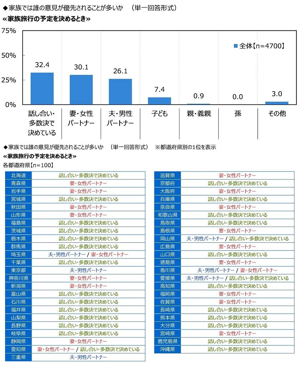 ≪家族旅行の予定を決めるとき≫では「話し合い・多数決で決めている」(32.4%)が最も高くなり、「妻・女性パートナー」(30.1%)、「夫・男性パートナー」(26.1%)、「子ども」(7.4%)、「親・義親」(0.9%)が続きました。