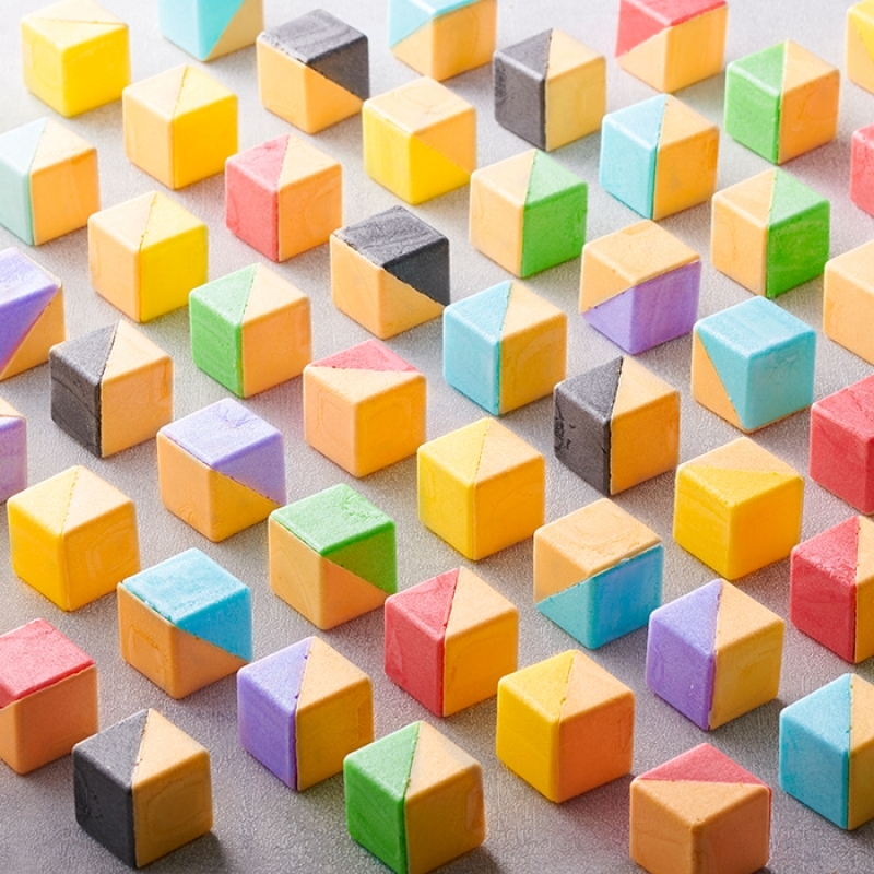 口当たりの軽いチョコレートをキューブ型の最中皮に詰めた和風ボンボンチョコ。カラフルな色味のサクッと香ばしい最中に、それぞれの色味にあったフレーバーのチョコレートを合わせた亀屋万年堂ならではのチョコレートです。黒・赤・黄色・紫・緑・水色の織りなす豊かな色合いはギフトで喜ばれること間違いなし!好きな人のカラーを選ぶこともでき、推し活にもおすすめです。