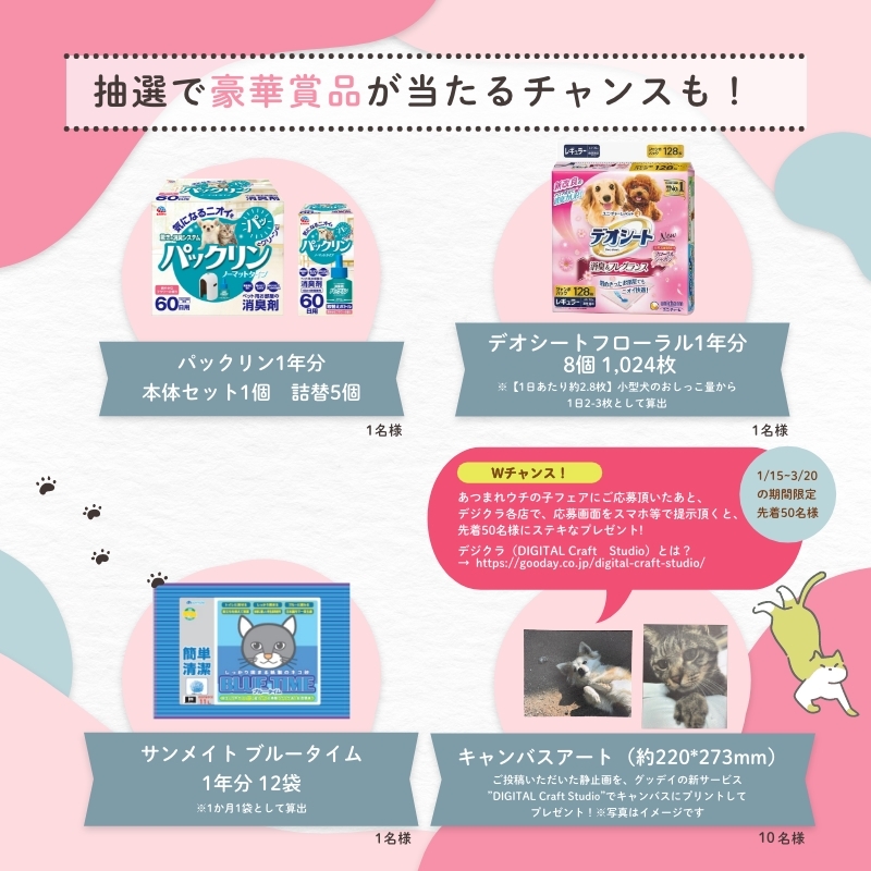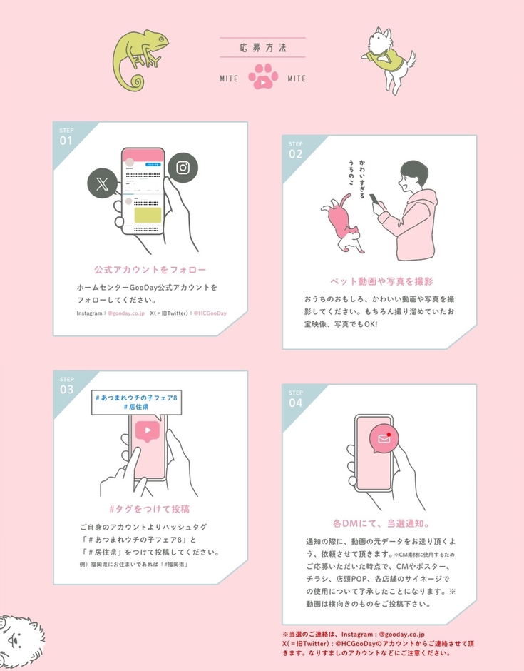 グッデイ公式Instagram及びX に、オーナーの皆様から ”ウチの子(ペット)” の動画や画像を投稿するキャンペーンです。投稿頂いた動画や画像の中から選ばれた ”ウチの子” は、2025年春に全店で実施する春のペットフェア「あつまれ ウチの子フェア 8」のTVCMやグッデイ店内で掲示する看板やポスター・店頭サイネージ・グッデイ公式YouTubeに使用します。