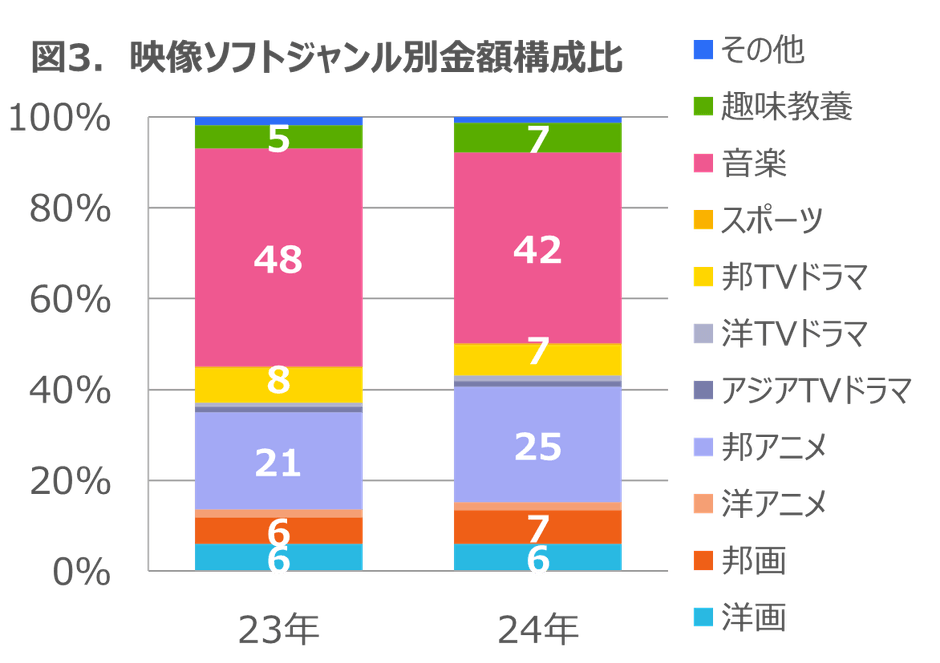 ジャンル別の金額構成比では音楽が最大ジャンルとなったが、好調であった前年から6%ポイント縮小の42%となった(図3)。その一方で、映画『THE FIRST SLAM DUNK』などのリリースがあった邦アニメが構成比を4%ポイント伸長させた。この2ジャンルで市場の67%を占めている。