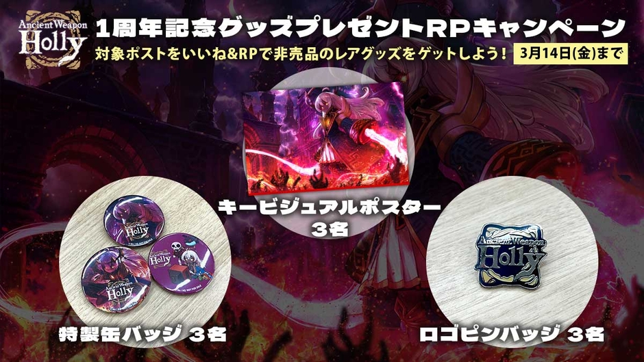 発売1周年を迎える3月8日より、超古代兵器ホリー【公式】アカウント(@AW_Holly_PR)のフォロー&RPキャンペーンを開催いたします!