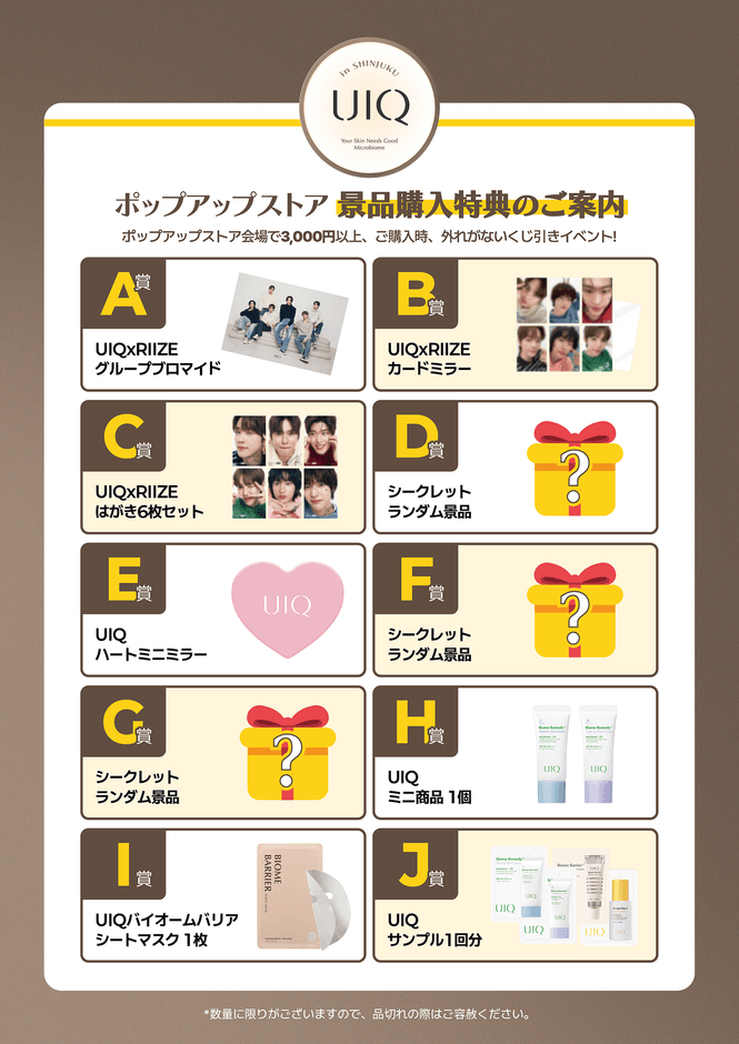 本イベントでは、UIQの新商品からベストセラーまでお試しいただけるブース をはじめ、さまざまな企画をご用意。また、専属モデルであるRIIZEのメンバー※等身大パネルと写真が撮れる撮影ブースも登場いたします。ここでしか体験できない特別イベントや購⼊特典もご用意しておりますので、この機会にぜひご来場ください!