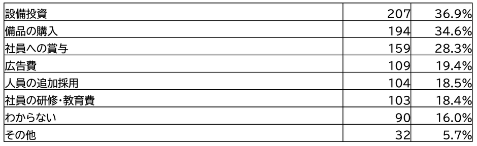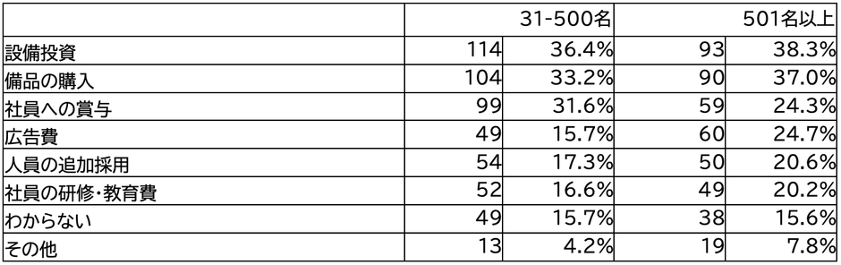 また従業員規模別で見ると、501名以上の企業では「広告費」、500名以下の企業では「社員への賞与」を採用する割合がもう片方と比べ高い傾向となった。
