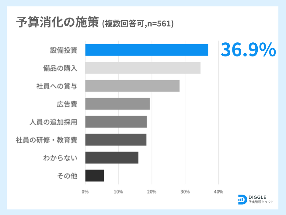 営業利益目標達成のために予算消化が必要になった場合どのような施策を採用するか聞いたところ、「設備投資」が最も多く36.9%であった。