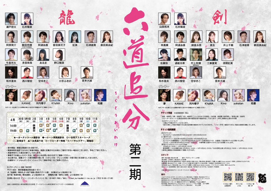 株式会社アリー・エンターテイメント主催、片肌☆倶利伽羅紋紋一座「ざ☆くりもん」 第33回ロングラン本公演『六道追分』(ろくどうおいわけ)が、4月5日(土)~8月3日(日)まで、シアターグリーン BASE THEATER(東京都豊島区南池袋2-20-4)にて、8期間にわたりキャストが入れ替わるロングラン公演として上演されます。
