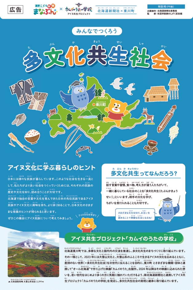 東川町が2023年11月に製作した映画「カムイのうた」を通じ、多文化共生社会の実現を目指す、アイヌ共生プロジェクト「カムイのうたの学校」。そのプロジェクトの一環として、道内小学生にアイヌ文化に興味を持ってもらうことを目的とした、道新こども向け新聞「まなぶん」タイアップ紙面を3月22日(土)に掲載しました。