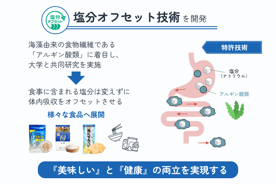 この塩分オフセット技術とは『塩分量は変えず舌で味を感じた後、体内で塩分(ナトリウム)を吸収されない形に変換し排出する』というこれまでの減塩とは異なる画期的な技術です。