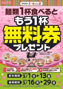 スガキヤ「2020年スーちゃん祭」 麺類1杯食べると、もう1杯無料券をプレゼント!2020年3月1日(日)より開催