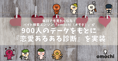 「omochi」は、21項目の質問から分かる「おもちキャラ診断」の結果を元に、全国60万件以上の求人情報から「自分にマッチする求人を探せる」バイト・インターン求人検索エンジンです。キャラ診断の結果と希望勤務地に基づき、マッチ度が高い順に求人情報を表示しますので、求職者は勤務地や業種、仕事内容だけでなく、自分とのマッチ度も考慮してバイト・インターンを探すことができます。