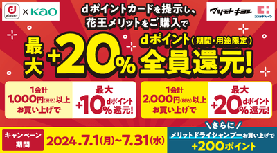 マツモトキヨシ・ココカラファインにおいて 「花王メリット購入で最大+20% dポイント還元キャンペーン」を開催