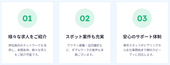 2024年9月より医師、看護師など様々な職種に対応した人材紹介サービス「メディカルクルー」を開始し、多数の求職者ご好評いただいております。また、求⼈取り扱い業種、⾮公開求⼈案件数は医療系専⾨職に特化した⼈材紹介サービスでNo.1*となっており、選任アドバイザーが求職者の転職を徹底サポートしております。