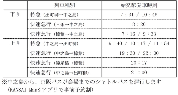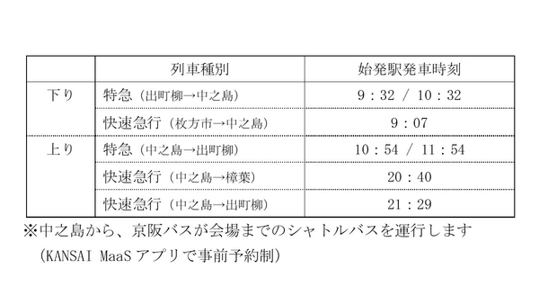 加えて、大阪・関西万博の開催期間中には、臨時列車として中之島駅発着の「特急」「快速急行」を設定し、京阪バスが運行する会場へのシャトルバス(事前予約制)が発着する中之島駅への利便性向上を図ります。