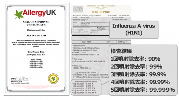 本製品は国際機関にて試験を実施し、5回のスチームで99.999%の除菌率が証明されています。