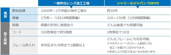 日本では海外工場での一括加工が一般的ですが、新サービスでは、東京都の葛西に「シャミールジャパンTOKYO」を置き、完全受注生産でレンズを加工。日本製のフレームに統一したプライベートブランドの商品展開「Made in JAPAN project」とあわせて、日本人がメガネに対して求める繊細で高い品質を実現するサービスです。