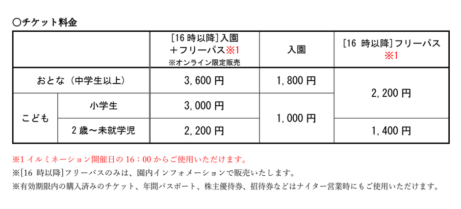 開催時間:17:00~閉園時間(11月~1月)、17:30~閉園時間(2月)、
