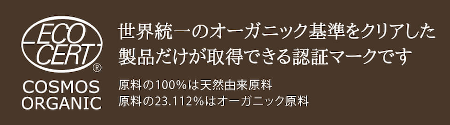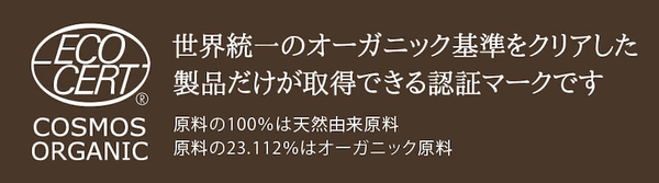 本製品は世界最大のオーガニック認証機関、エコサートが認証する「コスモスオーガニック認証」を製品自体で取得。