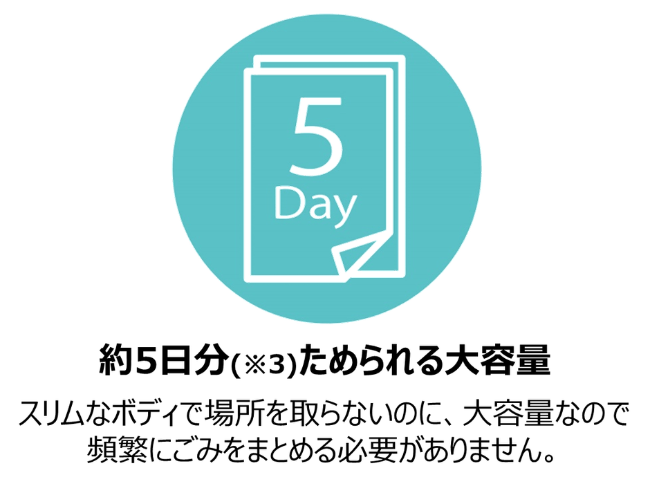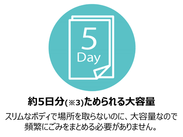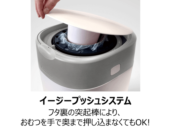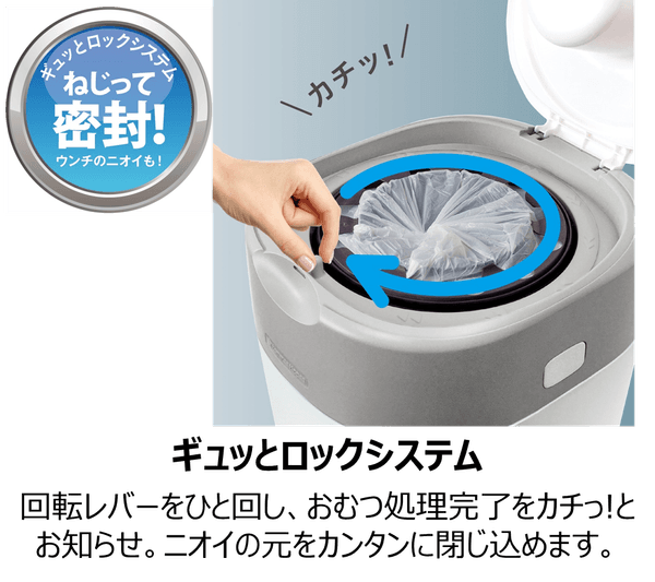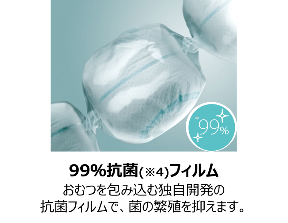 本製品は、紙おむつを1つ1つねじって密封する特許取得構造で、フタを開けても臭いません(※2)。また、約5日分(※3)の紙おむつをためられるので、まとめて捨てることができます。さらに、カセットは99%抗菌(※4)フィルムを使用しているので、菌の繁殖を抑制します。