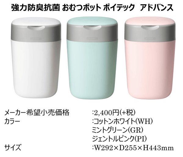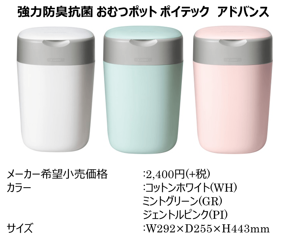 コンビ株式会社は、ねじって密封するからフタを開けても臭わない(※2)おむつポット「強力防臭抗菌 おむつポット ポイテック アドバンス」を2019年8月上旬より、全国のGMSやベビー用品専門店などで販売いたします。